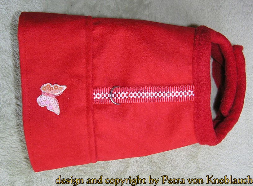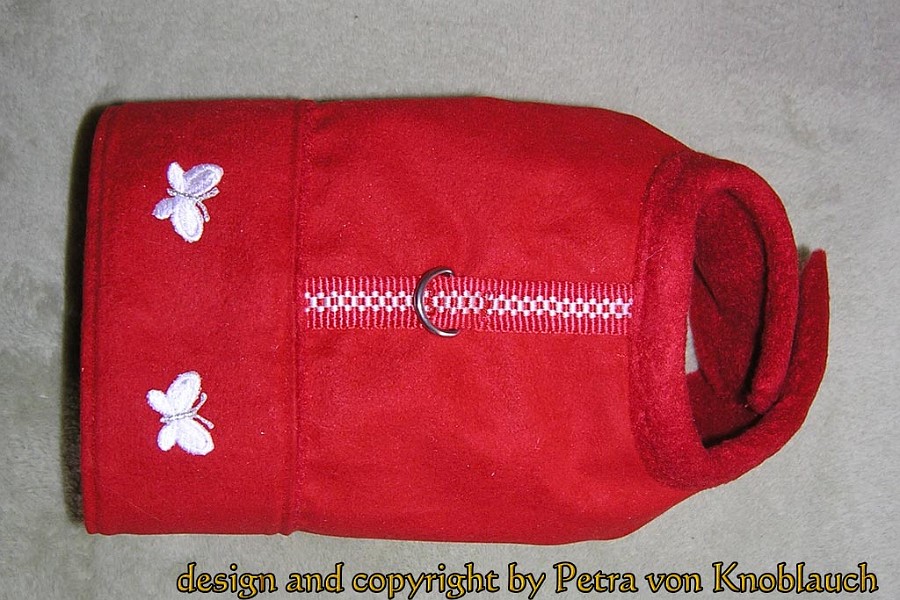 GS-0005 rotes Geschirr aus Wildlederimitat innen mit Polarfleece gefüttert auf dem Bund zwei Schmetterlingsapplikationen