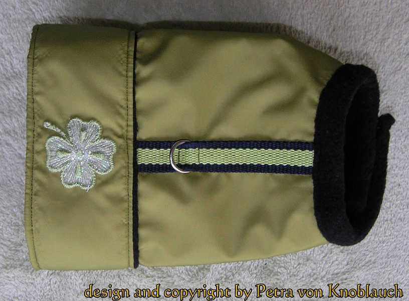 GS-0002 pistaziengrünes Geschirr aus wasserabweisender Popeline innen mit Polarfleece gefüttert auf dem Bund eine Kleeblattapplikation