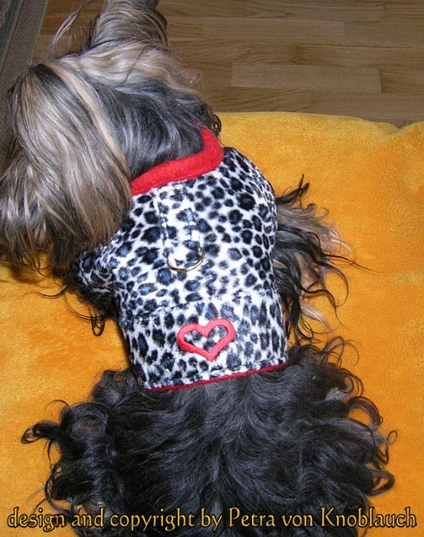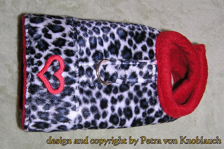 GS-0004 Geschirr aus Kunstfell im Gepardlook innen mit Polarfleece gefüttert auf dem Bund eine Herzapplikationen