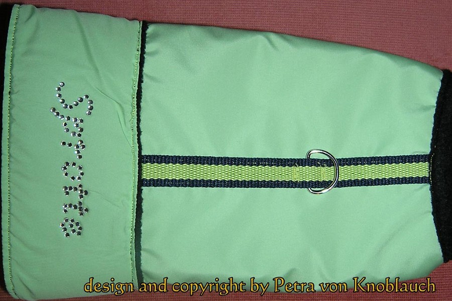 GS-0006 lindgrünes Geschirr aus wasserabweisender Popeline innen mit Polarfleece gefüttert auf dem Bund Namensapplikation aus Strasssteinen