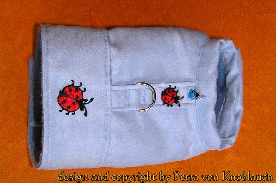 GS-0007 Hellblaues Geschirr aus Waschleder innen mit Polarfleece gefüttert auf dem Rücken Marienkäferapplikationen und Glückskäferanhänger