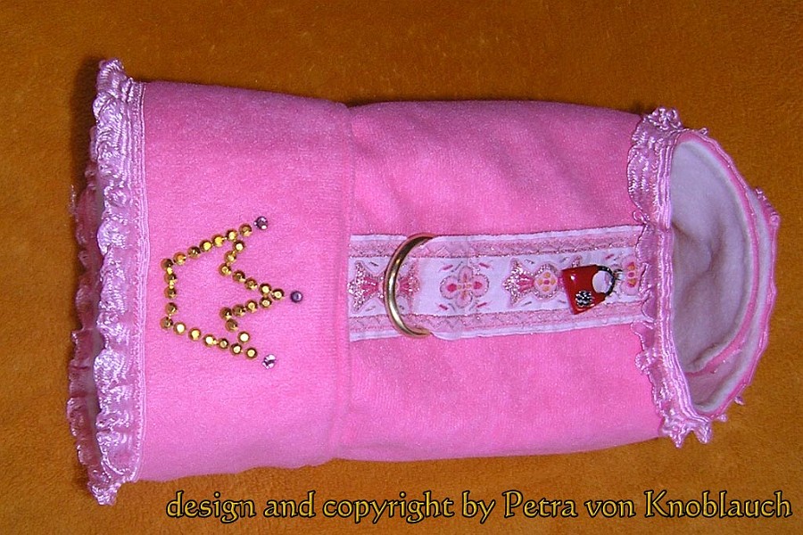 GS-0008 rosafarbenes Geschirr aus Alkantaraimitat innen mit Polarfleece gefüttert auf dem Bund eine Kronenapplikation Gürtel und Halsausschnitt mit Rüschenborte besetzt und Shoppingtaschenanhänger