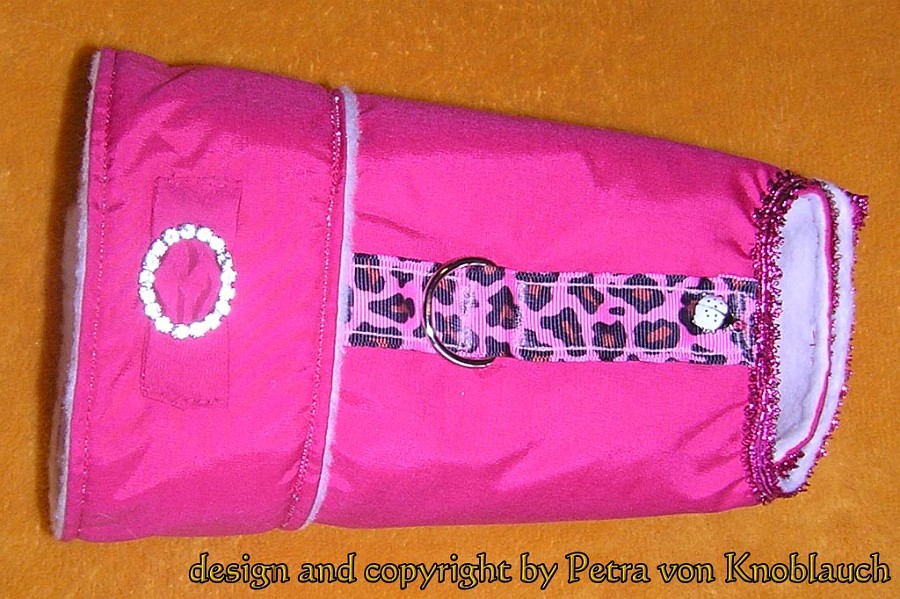 GS-0009 pinkfarbenes Geschirr aus wasserabweisender Popeline innen mit Polarfleece gefüttert auf dem Bund eine kleine Strassschnalle Halsausschnitt mit glitzernder Borte besetzt und Glückskäferanhänger