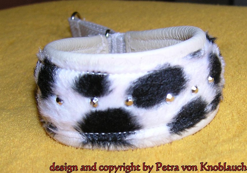 Hb-0001 Zugstopphalsband aus weißem Nappaleder mit Kunstfell in Dalmatineroptik - besetzt mit Metallstuts