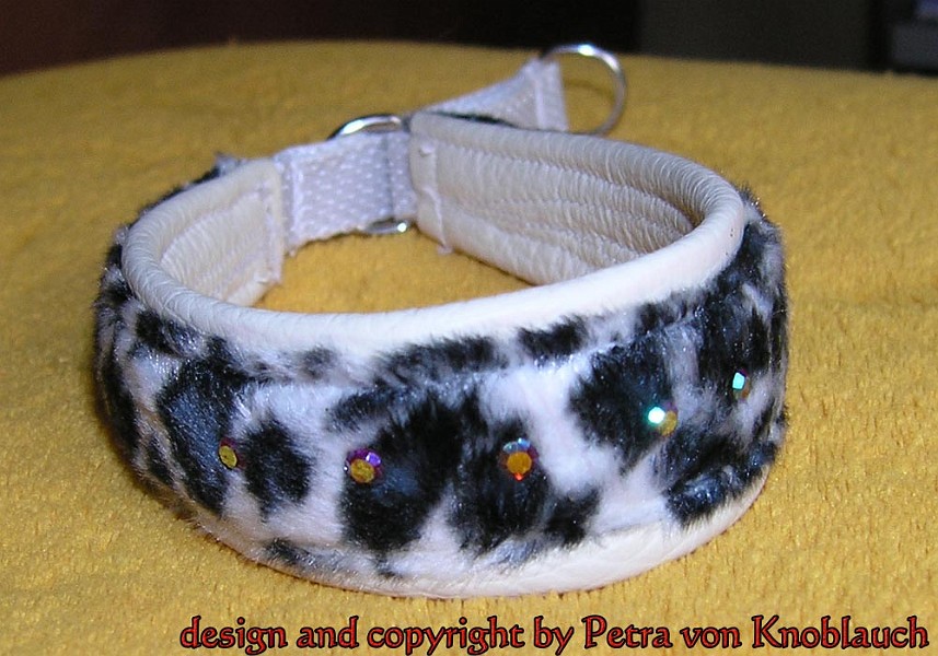Hb-0002 Zugstopphalsband aus weißem Nappaleder mit Kunstfell in Schneeleopardenoptik - besetzt mit Strasssteinen