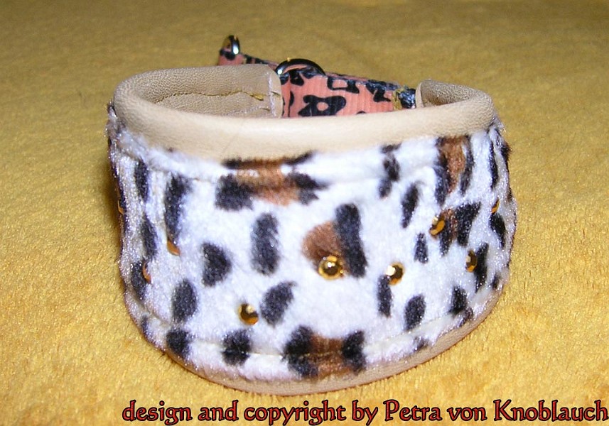 Hb-0003 Zugstopphalsband aus beigefarbenem Nappaleder mit Kunstfell im Gepardenlook - besetzt mit goldenen Metallstuts