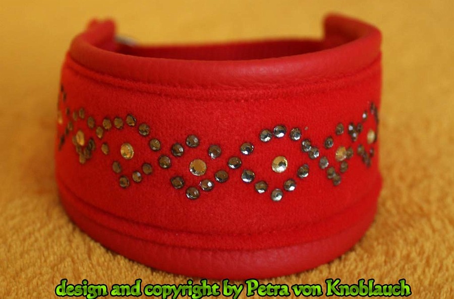 Hb-0005 Zugstopphalsband aus rotem Nappaleder mit rotem Alcantaraimitat besetzt - verziert mit glitzernden Strasskristallen