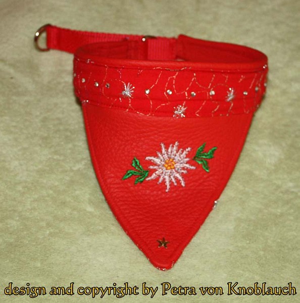 Hb-0006 Zugstopphalsband aus rotem Nappaleder mit eingearbeitetem Dreieckstuch - verziert mit Stickerei und glitzernden Strasskristallen
