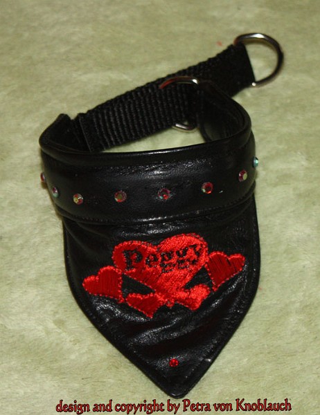 Hb-0008 Zugstopphalsband aus schwarzem Nappaleder mit eingearbeitetem Dreieckstuch - verziert mit Stickerei und glitzernden Strasskristallen
