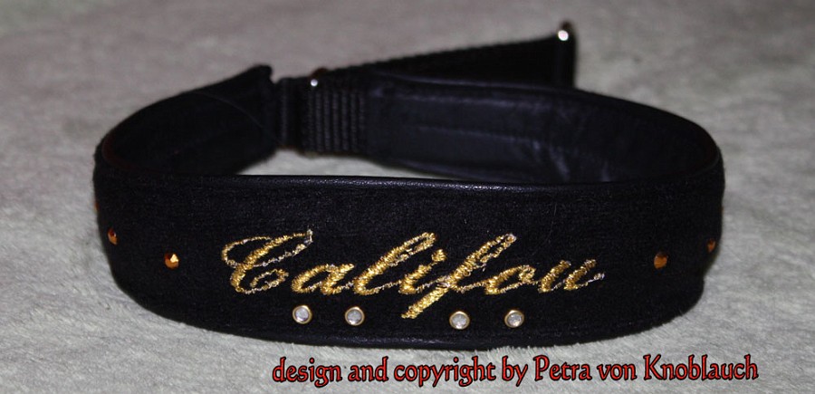 Hb-0007 Zugstopphalsband aus schwarzem Nappaleder mit schwarzem Alcantaraimitat besetzt - verziert mit gesticktem Namenszug und glitzernden Strasskristallen
