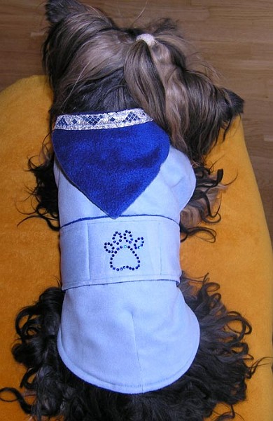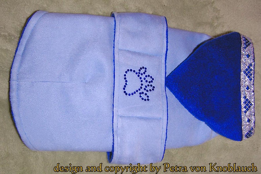 ML-006a Hundemantel aus hellblauem Waschleder innen mit Antipillingfleece gefüttert Kapuze mit silber/blauer Borte besetzt den Gürtel ziert eine Pfötchenapplikation aus blauen funkelnden Strasssteinen